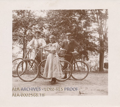 Miss Farr, Miss Shaffner, and Mr. Faxon on bicycles in Philadelphia at the 1897 ALA Annual Conference in Philadelphia, Pennsylvania.