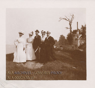 Photograph of ALA conference attendees at the assembly grounds at the 1898 ALA Annual Conference. Includes Dr. B. C. Steiner, Mary L. Stillman, Agnes Van Valkenburg, Mr. Parsons, and Martha L. Jeschke.