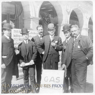 Librarians meeting by a sign reading "Gas Congress" at the St. Lous Fair sometime around the 1904 ALA Annual Conference in St. Louis, Missouri.