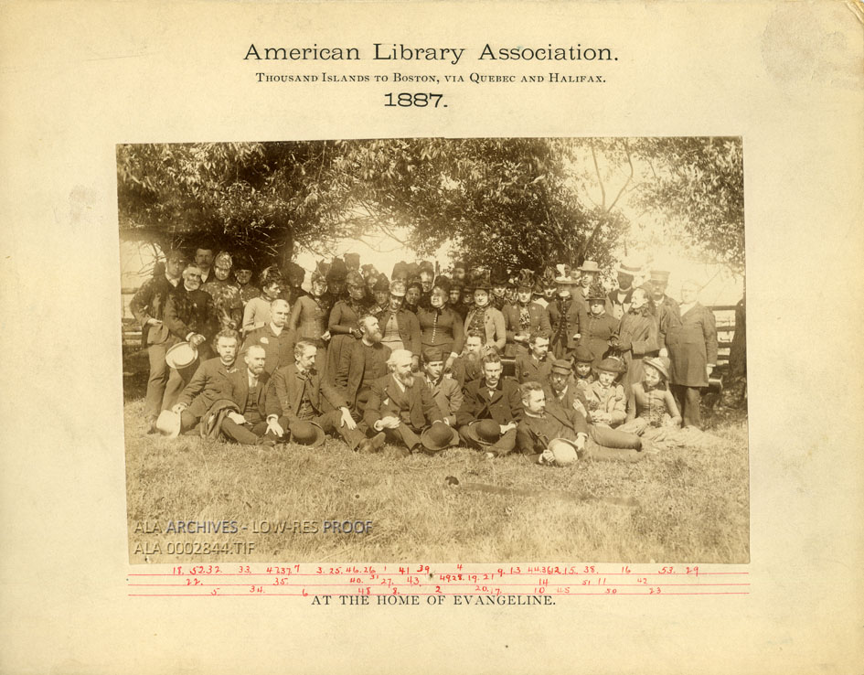 A group of ALA members during the 1887 Annual Conference at Thousand Islands, posing at the Home of Evangeline. The back includes a list of the individuals in the photograph.