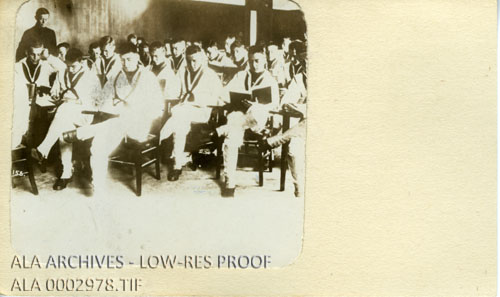 A room of Naval soldiers reading or studying, perhaps at a Naval training station school.