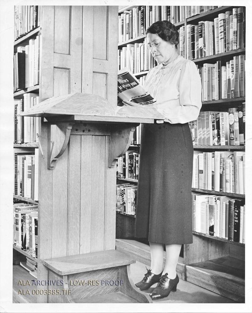 Photograph of Miss Vosper reading a book in the Booklist Office at ALA Headquarters.