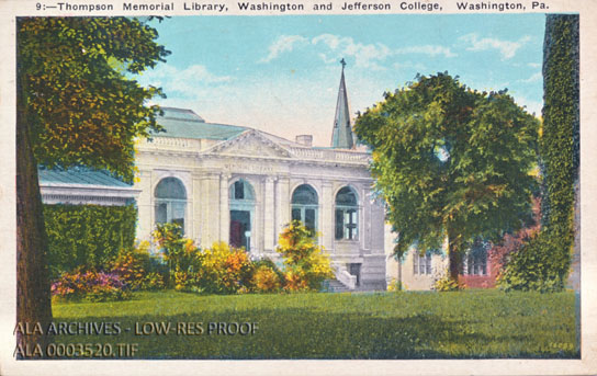 Postcard of the Thompson Memorial Library at Washington and Jefferson College in Washington, Pennsylvania.