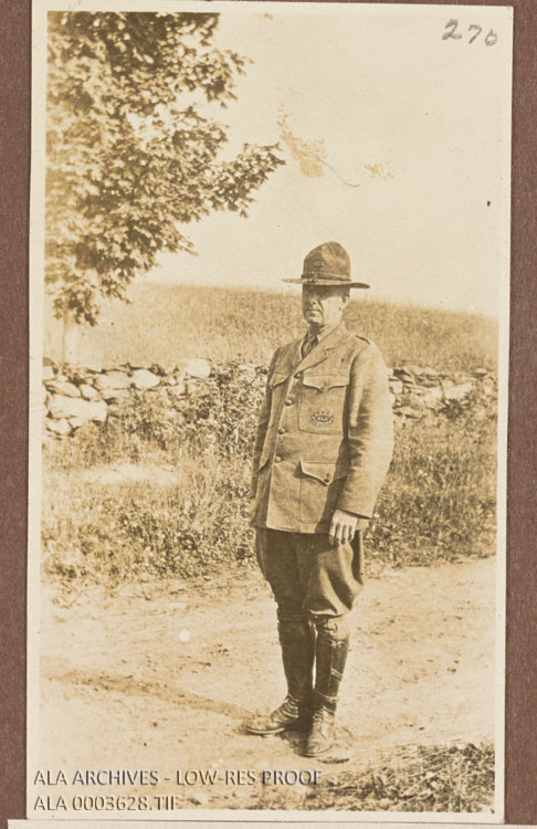 T.R. Temple, librarian at Quincy Public Library in Massachusetts, standing outside in his Library War Service uniform.