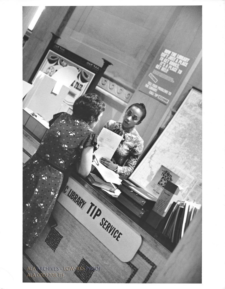 The Information Place - Reference services at the Detroit Public Library. Photograph of a librarian helping a library worker at the reference desk.