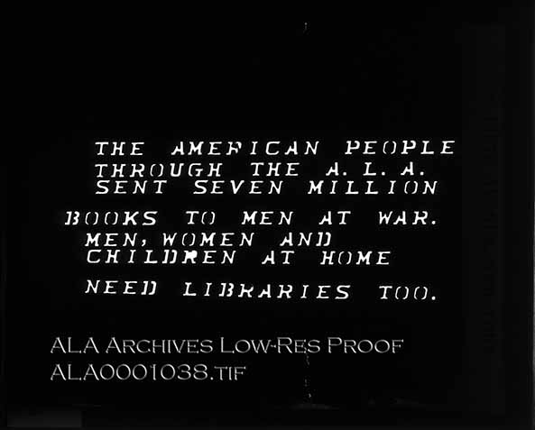 A glass plate that reads: "The American people through the ALA sent seven million books to men at war. Men, women and children at home need libraries too."