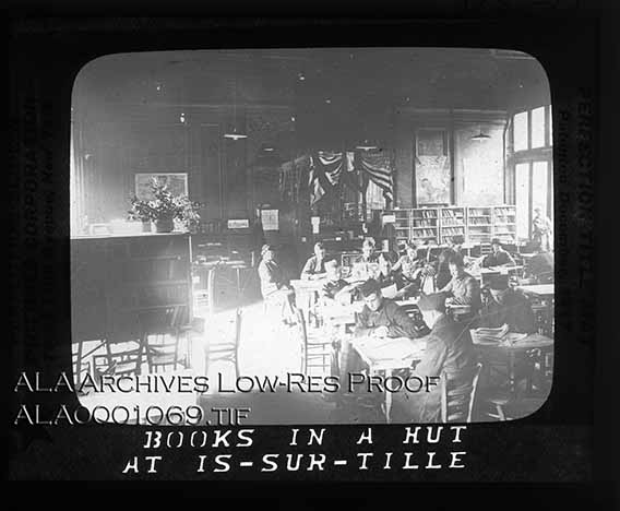 Caption on the side reads: "Books in A Hut At Is-sur-Tille."