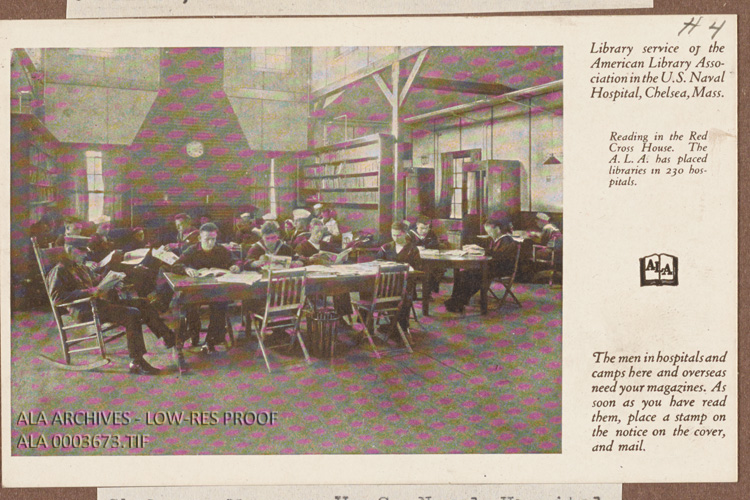 Postcard caption reads: Library service of the American Library Association in the U.S. Naval Hospital, Chelsea, Mass.