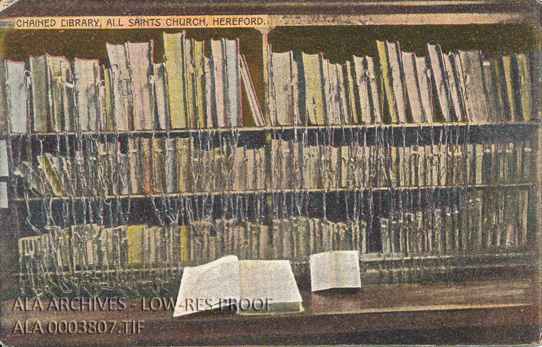 Postcard of a chained library at All Saints Church in Hereford, England.