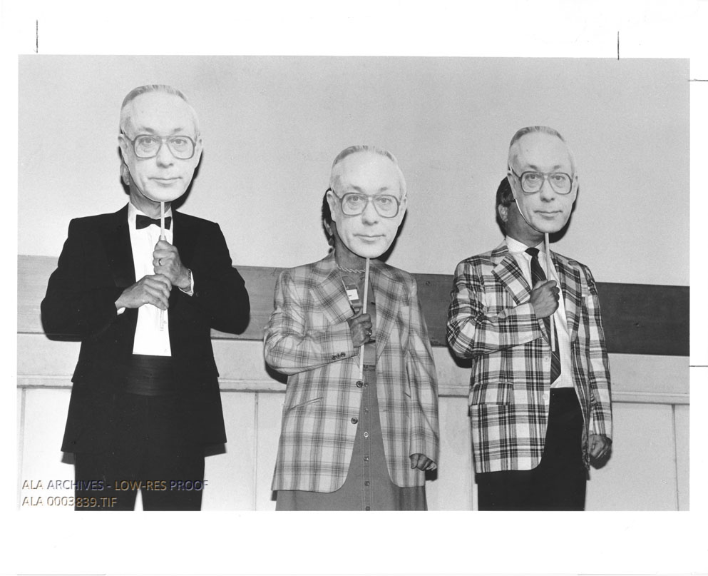 Unidentified ALA members wearing masks of Charles Robinson's face, librarian at the Baltimore County Public Library and a Public Library Association leader.