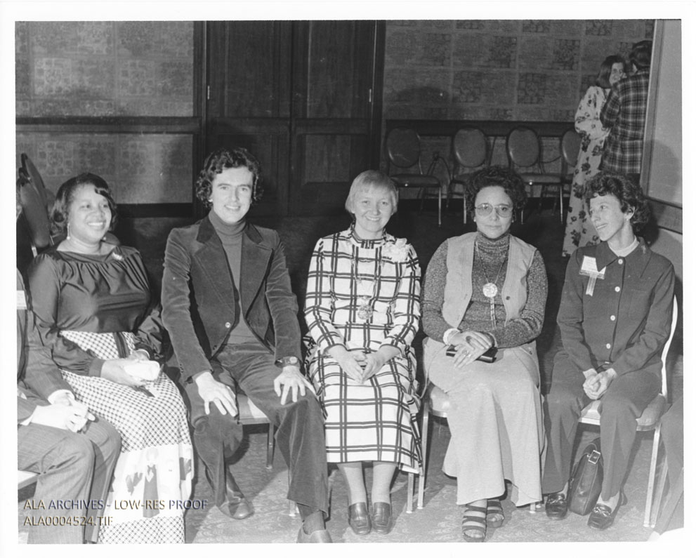 Photograph of Barbara Rollack, Gerald McDermott (Caldecott winner), Bette Peltola (Newbery-Caldecott Selection Committee, chair), Virginia Hamilton (Newbery winner), and Susan Hirschman at the 1975 Newbery-Caldecott Awards.