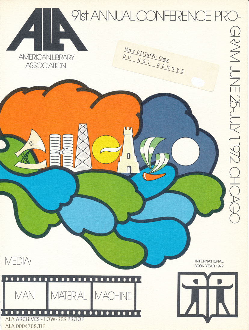 Program cover from the 91st Annual Conference. Held in Chicago, Illinois from June 25-July 1, 1972. The theme for this conference was "Media: Man Material Machine." The cover also depicts the logo for the International Book Year 1972 as established by UNESCO.