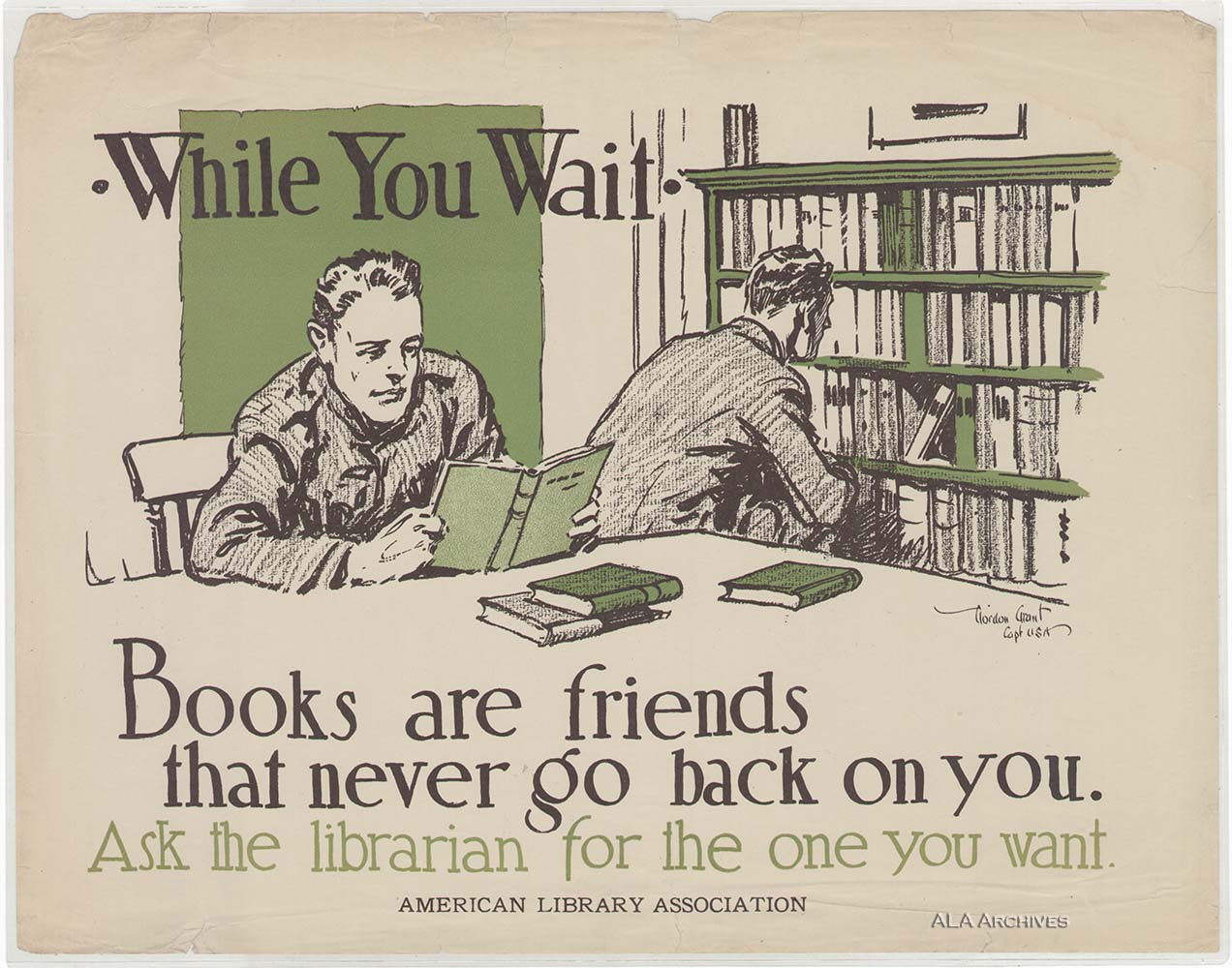 Poster text reads: While You Wait; Books are friends that never go back on you. Ask the librarian for the one you want. American Library Association.