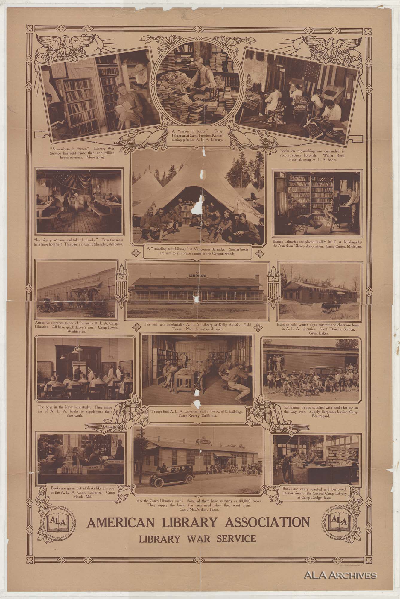 World War I poster with 15 scenes of camp libraries and soldiers using them. Printed by Alco-Gravure, Inc. (N. Y.)