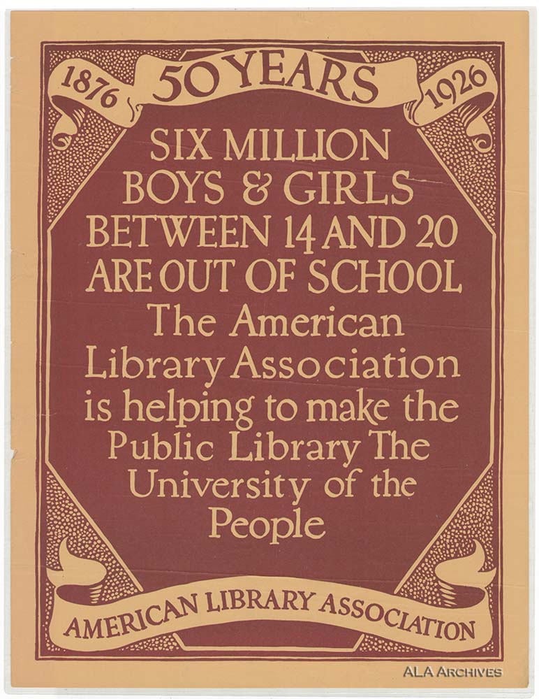 Poster text reads: 1876-1926; 50 Years; Six Million Boys and Girls between 14 and 20 are out of school; The American Library Association is helping to make the Public Library the University of the People