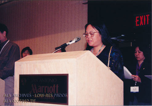 Patty Wong, President of the Asian Pacific American Librarians Association, speaking at the Martin Luther King, Jr. Holiday Observation and Sunrise Celebration at the 2000 ALA Midwinter Meeting in San Antonio.