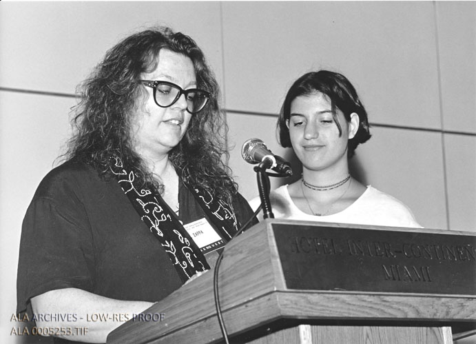 Gail and Diva Zappa speaking at the Intellectual Freedom Round Table program at the 1994 ALA Annual Conference.