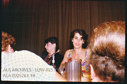 Marcia Pally, of the Feminist Anti Censorship Taskforce and program panelist, speaking to program attendees after the Intellectual Freedom Round Table panel at the 1986 ALA Annual Conference, with Evelina Kane, of the Women Against Pornography, to the left.
