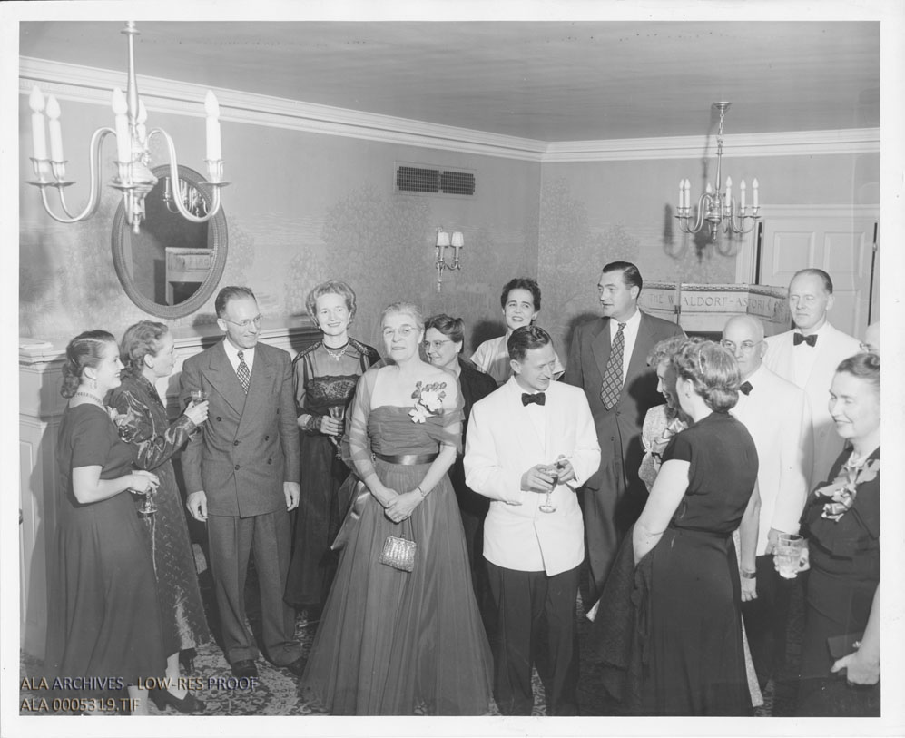 Cocktail party preceding the fourth general session of the 1952 ALA Annual Conference at New York. Includes Evelyn Tintera, Fannie Sheppard Noonan, Loleta Fyan, David Clift, Grace Stevenson, and Robert Downs.