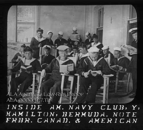 Glass plate slide showing servicemen reading. Caption reads: "Inside American Navy Club, Y, Hamilton, Bermuda. Note FRBR Canad. & American." Duplicate image of ALA0000322
