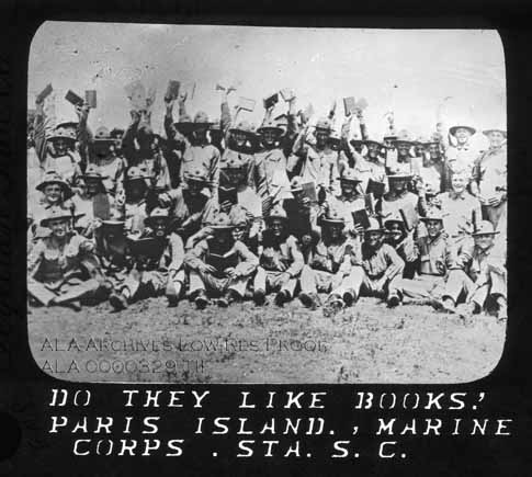 Glass plate slide showing servicemen enthusiastically presenting their books. Caption reads: "Do They Like Books. Paris [sic. Parris] Island, Marine Corps Station, South Carolina."