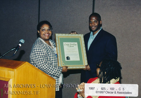 Photograph of R. Gregory Christie receiving the Coretta Scott King Book Award Illustrator Honor from Deborah Taylor at the 1997 ALA Annual Conference in San Francisco. Also pictured is Sandra Payne.