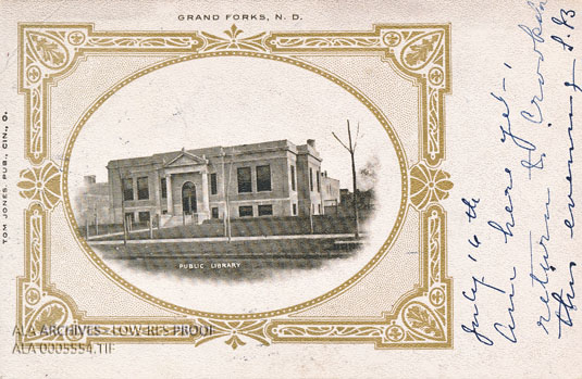 Postcard of the Public Library in Grand Forks, North Dakota. Published by Tom Jones, Cin., Ohio.