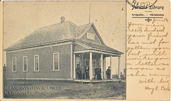 Postcard of the Fernald Library in Arapaho, Oklahoma. Spelled as "Furnald" on the card. Published by Clarion.