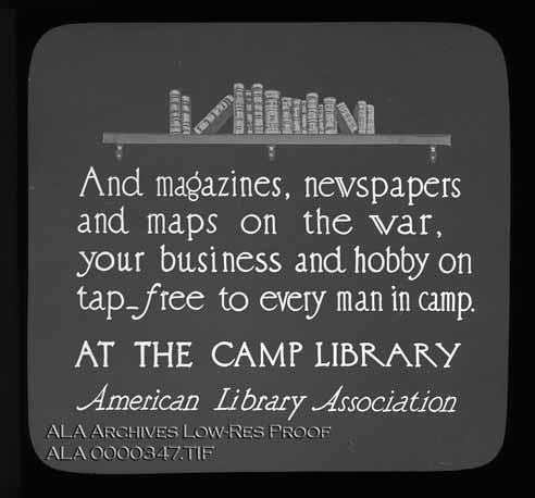 Glass plate slide. Caption reads: "And magazines, newspapers and maps on the war, your business and hobby on tap - free to every man in camp. AT THE CAMP LIBRARY"