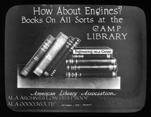 Glass plate slide. Caption reads: "How About Engines? Books On All Sorts at the CAMP LIBRARY"