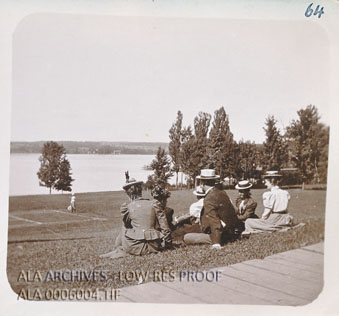 A group watching a tennis match, including Purd Wright, Miss Oakley, Nina Browne, Lydia Dexter, Mary Farr, Miss Wallace, and Mr. Burns, at the ALA Annual Conference at Lakewood-on-Chautauqua, New York.
