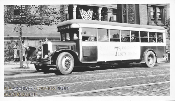 Photograph of a bus taking conference attendees to lunch on "Philadelphia Day" part of the ALA Fiftieth Anniversary Conference.