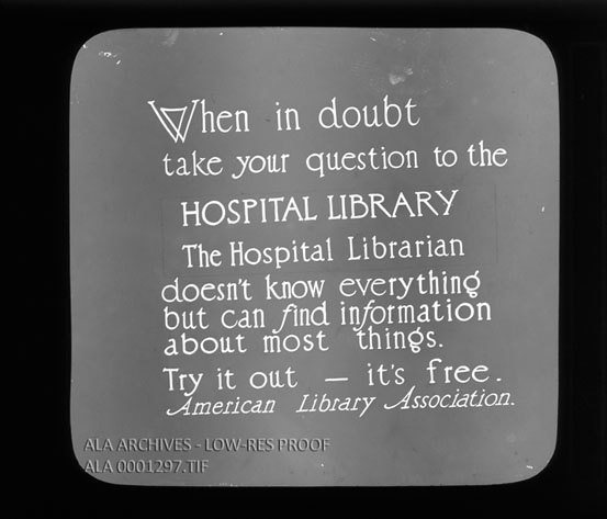 Glass plate slide advertisement reads: When in doubt take your question to the HOSPITAL LIBRARY The Hospital Librarian doesn't know everything but can find information about most things. Try it out - it's free.