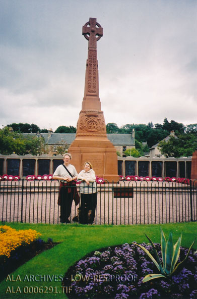 Photo of Leonard Kniffel (L) and Carol Erickson (R) in front of an Inverness war memorial in the shape of a Celtic cross commemorating World War I. The text at its base reads: "To the glorious memory of the men of the burgh and parish of Inverness who laid down their lives in The Great War, 1914-1918."