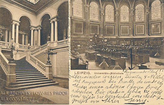 Postcard of the staircase and reading room in the Leipzig University Library in Germany.