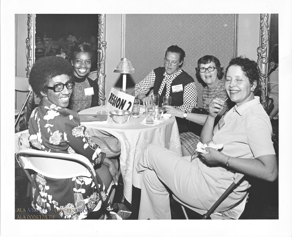 Photograph of a group at a table during an American Association of School Librarians program during the 1974 ALA Annual Conference. Table tent on the table reads: Region 2