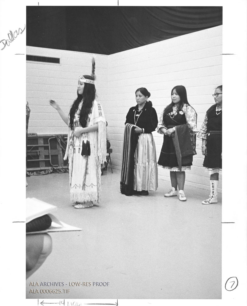 Four unidentified individuals dressed in regalia during the Social Responsibilities Round Table's Task Force on the American Indian's program at the 1971 ALA Annual Conference in Dallas.