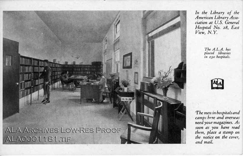Postcard caption reads: In the Library of the American Library Association at U.S. General Hospital No. 28, East View, N.Y.