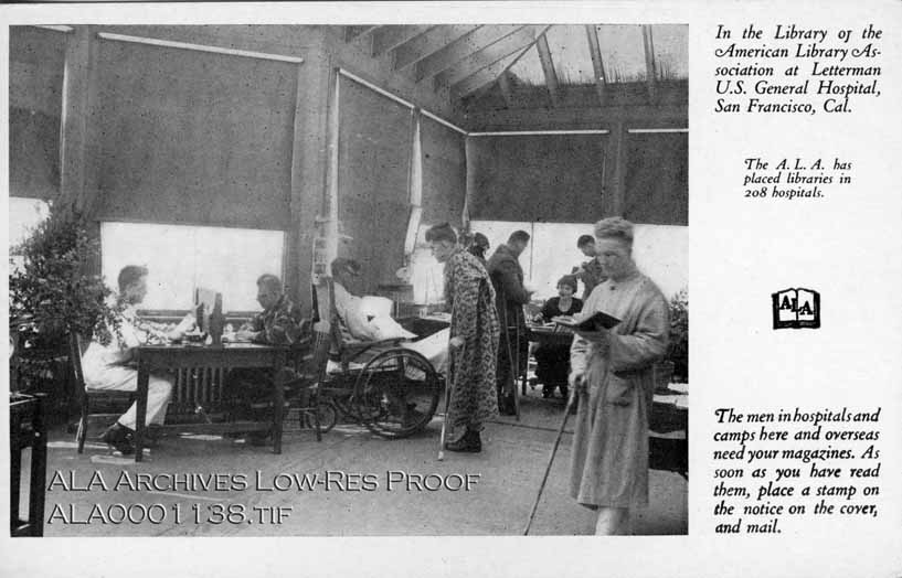Postcard caption reads: In the Library of the American Library Association at Letterman U.S. General Hospital, San Francisco, Cal.
