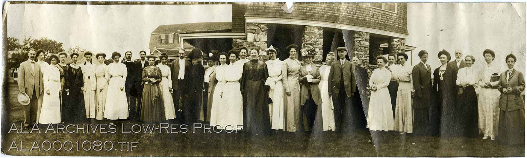Photograph of members of the American Library Association at Sparhawk Hall in New Hampshire during the 1909 Annual Conference in July.