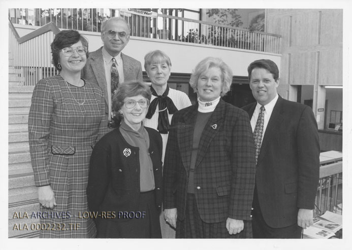 Photograph of Chesapeake Alliance members, from left to right, Susan Martin, Mod Makkawi, Ann MacLeod, Barbara Smith, Susan Bryteson, and James Neal. Photograph was featured in the College and Research Libraries News, 05-1996, page 278.