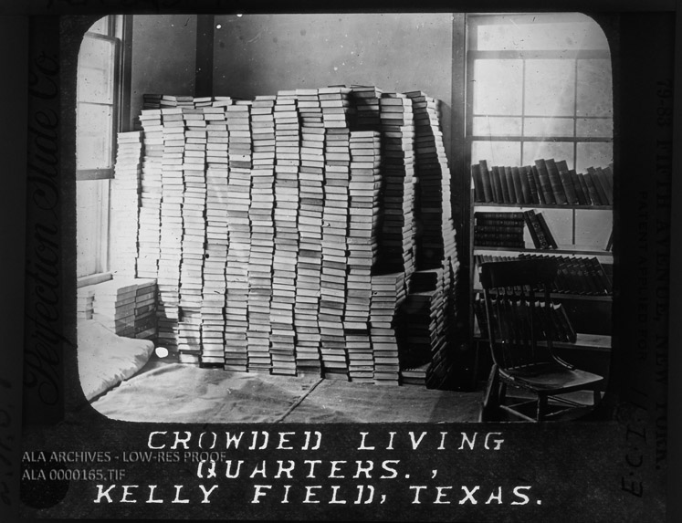 Glass plate slide showing large piles of books at the ALA Camp Library at Kelly Field, near San Antonio, Texas