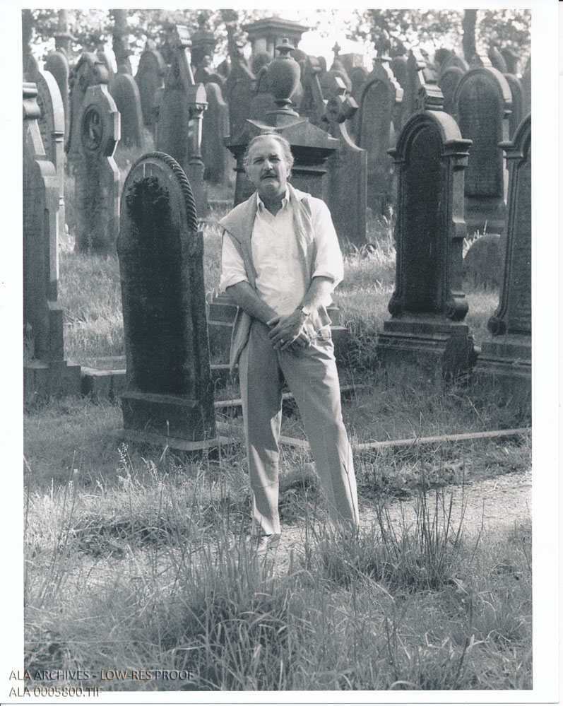 Caption: Carlos Fuentes (1991) in the cemetery of Hawthorn, England, where the Bronte sisters are buried. Photograph reproduced courtesy of Carlos Fuentes. Found in RS 22/3/6, Box 2, Folder: Photos - File - F