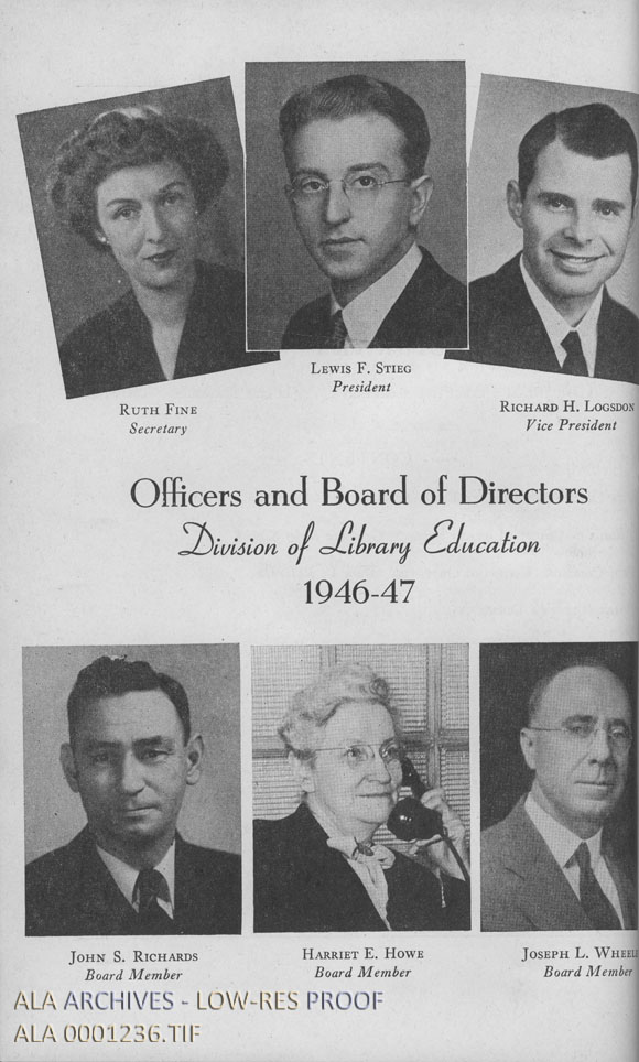 Page 2 of the ALA Bulletin, volume 41, number 1, January 1947. Picture of officers and board of directors of the Division of Library Education. Pictured are Ruth Fine, Lewis F. Stieg, Richard H. Logsdon, John S. Richards, Harriet E. Howe, and Joseph E. Wheeler.