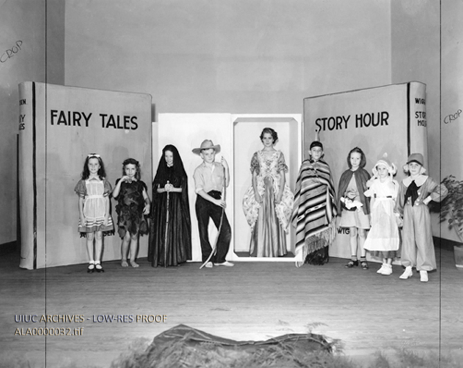 Children on a stage in a play at the end of the Vacation Reading Club of the Rosenberg Library in Galveston, Texas.
