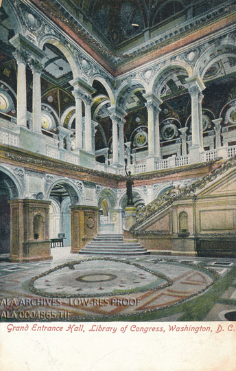 Postcard of the grand entrance hall of the Library of Congress in Washington, D.C.
