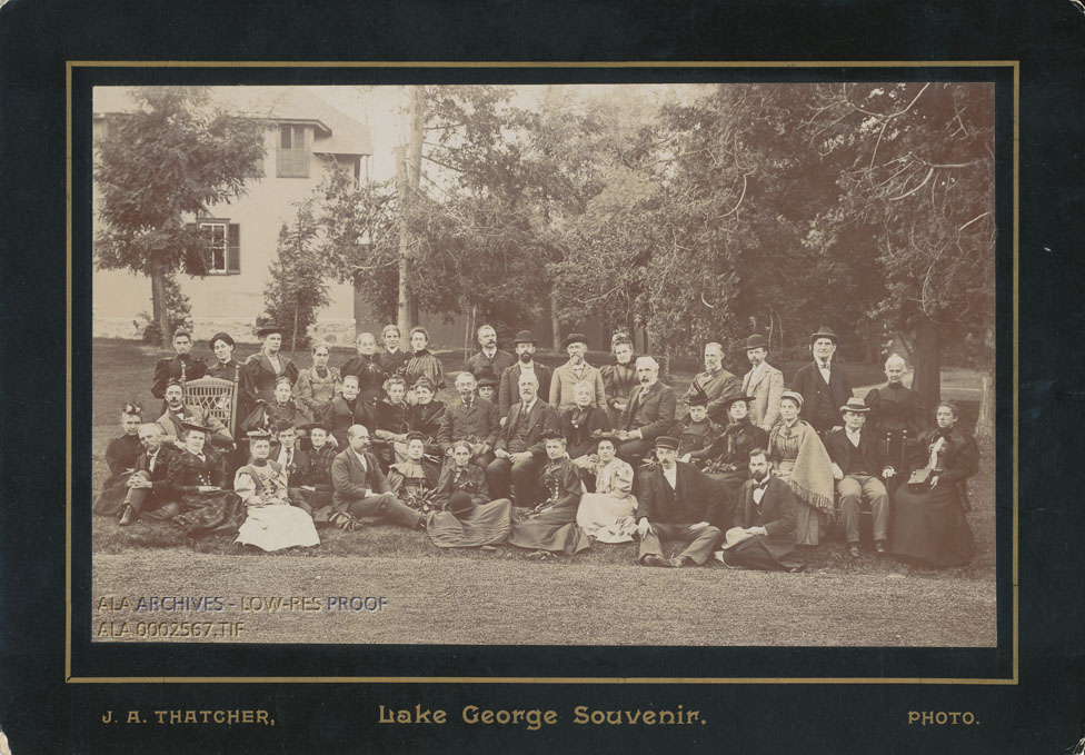 Group photograph of conference attendees from the 1894 ALA Annual Conference at Lake Placid, attending a post conference party at Lake George.