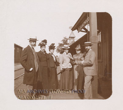 Massachusetts Library Club members standing at the train station, saying goodbye to departing friends at the end of the 1898 ALA Conference at Lakewood-on-Chautauqua, New York.