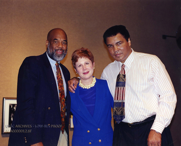 Mary Somerville, Director of Libraries in the Miami-Dade Public Library System, Florida, poses with Muhammad Ali during a book signing fundraiser held at the Main Library, 1995. Unknown man, left.