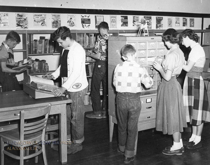 Eighth grade students at their school library. Danville Elementary School Library Service, Danville, Illinois; in Illinois Libraries January, 1953.